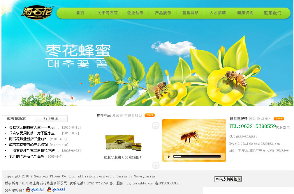 (韓國獨資)棗莊市海石花蜂業(yè)有限公司 海石花蜂業(yè)有限公司始創(chuàng)于1982年7月,座落在舉世聞名的冠世榴園腹地,這里群山起伏,榴花似火,蜜蜂翩翩飛舞,風景秀麗。 海石花蜂業(yè)是一家集養(yǎng)蜂、蜂產(chǎn)品深加工科貿(mào)為一體化的出口型企業(yè),產(chǎn)品出口日本、韓國、加拿大等諸多國家。公司現(xiàn)有四大養(yǎng)蜂基地:中國冠世榴園生態(tài)養(yǎng)蜂基地、云南西雙版納生態(tài)養(yǎng)蜂基地、黃山藥谷養(yǎng)蜂基地、山海關(guān)范家鎮(zhèn)有機蜂產(chǎn)品基地.充足的蜜源保證了產(chǎn)品更純、更鮮的特點。海石花企業(yè)擁有多項行業(yè)領(lǐng)先的技術(shù),所有產(chǎn)品均通過HACCP食品安全管理體系認證、綠色食品認證、有機食品認證等. 公司總經(jīng)理周長信曾先后兩次在人民大會堂受到國家總理溫家寶、國家副總理回良玉的親切接見,被譽為中國養(yǎng)蜂狀元.現(xiàn)任中國蜂協(xié)理事,市政協(xié)常委委員. 由著名導演張惠中執(zhí)導,張繼編劇的電視連續(xù)劇《石榴花開》中海石花蜂業(yè)系列蜂產(chǎn)品有多次不同角度的呈現(xiàn),《石榴花開》的許多劇情都是在海石花公司、海石花養(yǎng)蜂基地拍攝的,首播已在陜西綜藝臺等地方電視臺陸續(xù)開播,隨后各地方衛(wèi)視都將全面播出。 公司不斷發(fā)展壯大,形成了集海石花蜂業(yè)養(yǎng)蜂基地、海石花蜂業(yè)生產(chǎn)基地為一體的現(xiàn)代化、規(guī);某隹谛推髽I(yè),成為國內(nèi)同行業(yè)中的佼佼者。 海石花蜂業(yè)有限公司技術(shù)力量雄厚,產(chǎn)品已發(fā)展為六大系列、100多個單品,產(chǎn)品出口日本、韓國、加拿大等諸多國家。 棗莊網(wǎng)站制作 |